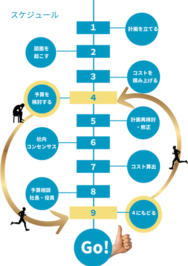 ①計画を立てる → ②図面を起こす → ③コストを積み上げる → ④予算を検討する → ⑤計画再検討・修正 → ⑥社内コンセンサス → ⑦コスト算出 → ⑧予算相談(社長・役員) → ⑨ ④に戻る