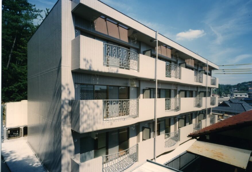斜面のため基礎工事を階段状に施工したり、駐輪場部分を土留めコンクリートを利用した。